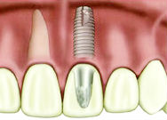A dental implant is a titanium root form that is surgically placed in the jawbone by an oral surgeon or periodontist. During recovery, the body brings more bone-building minerals to the site, integrating the root form and making it part of the jawbone. After this healing period, the patient would then come into Root Dental to have Dr. Root get a final impression of the implant. From this final impression, a custom abutment and a crown are fabricated and a few weeks later Dr. Root will cement the crown to the abutment and implant. The illustration to the right shows the implant replacing the tooth root as well as the crown. Dental implants can be used to replace one or many teeth. In fact, they can anchor an entire upper or lower arch of dentures, solving many of the problems people encounter with dentures.